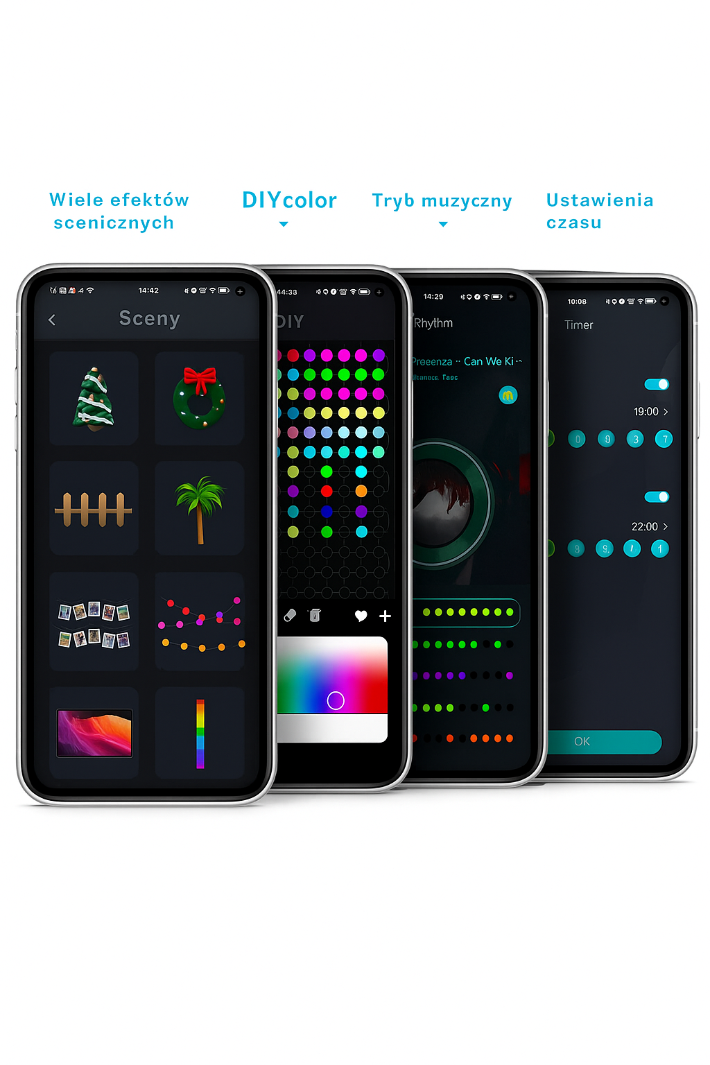- Sterowanie przez aplikację Bluetooth – połącz się z telefonem i zmieniaj kolory, jasność i efekty za pomocą darmowej aplikacji 📲